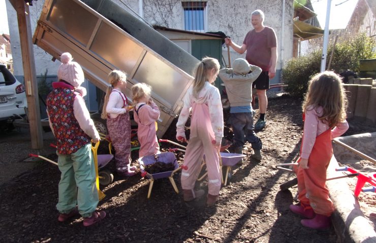 Am Donnerstag, 26.02.2026 trafen sich Eltern und Kinder im Löwenzahngarten: Es galt, einen Anhänger voller Rindenmulch zu verteilen. Angeführt wurde die Aktion von Vereinsmitglied Hans-Jürgen, der den Rindenmulch organisiert hatte und tatkräftig mit anpackte. Große und kleine Schubkarren wurden eifrig gefüllt und der Rindenmulch auf den Wegen und Flächen im Spielgarten ausgebracht. Zusammen ging die Arbeit schnell von der Hand und bereitete allen Spaß. „Wenn´s bei uns viel Arbeit gibt, dann packen alle zu…“, sangen die Kinder spontan bei der Arbeit, „…und zusammen, ja zusammen schaffen wir´s im Nu!“. Der Nachmittag klang im Sonnenschein bei Apfelschorle und leckeren Muffins aus, die die Kinder mit einer Erzieherin am Vormittag gebacken hatten.